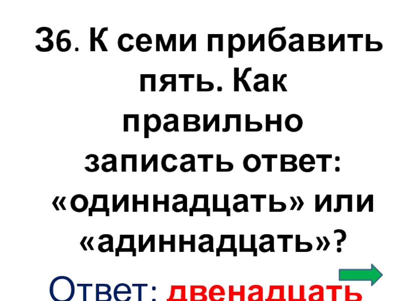Слайд 44З6. К семи прибавить пять. Как правильно записать ответ: «одиннадцать» или