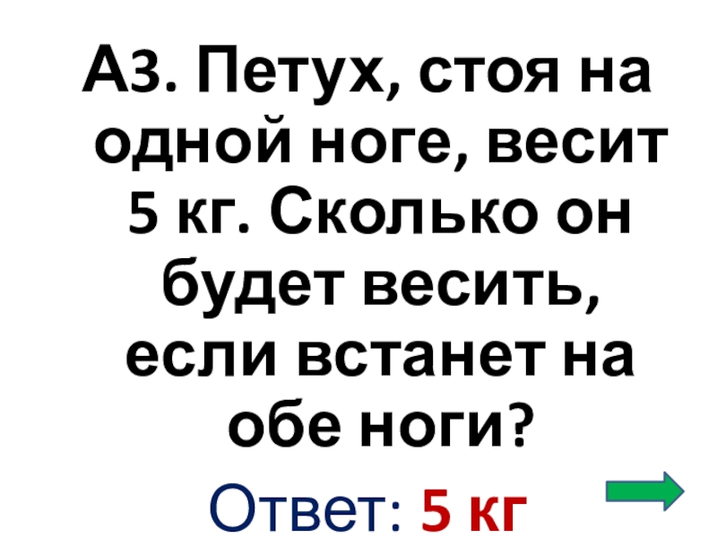 Слайд 4А3. Петух, стоя на одной ноге, весит 5 кг. Сколько он