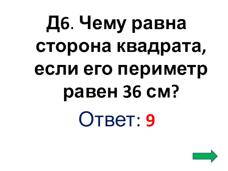 Слайд 27Д6. Чему равна сторона квадрата, если его периметр равен 36 см?