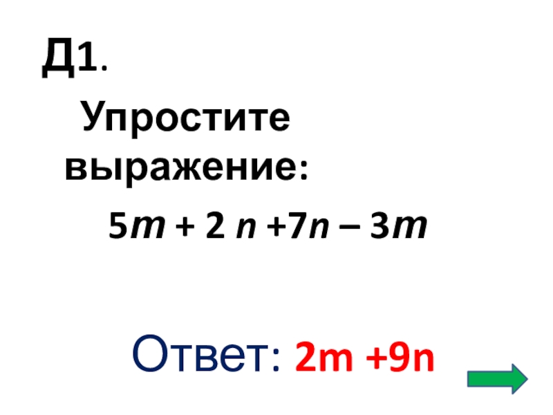 Д1.   Упростите выражение:    5т + 2 n +7n – 3тОтвет: 2m +9n