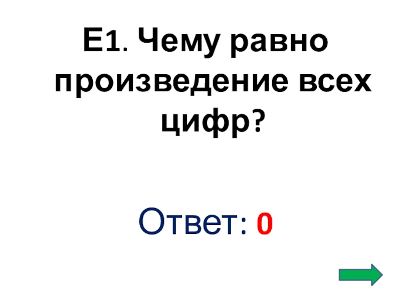 Слайд 30Е1. Чему равно произведение всех цифр?