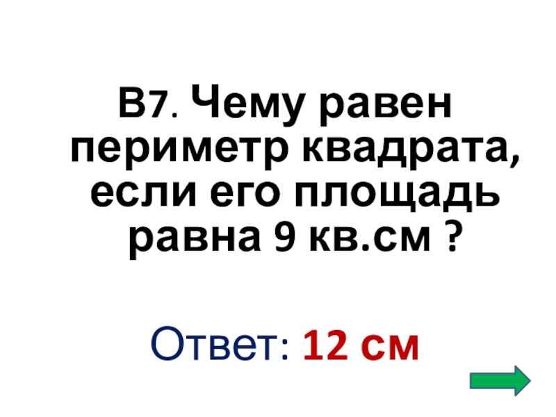 В7. Чему равен периметр квадрата, если его площадь равна 9 кв.см ?Ответ: 12 см
