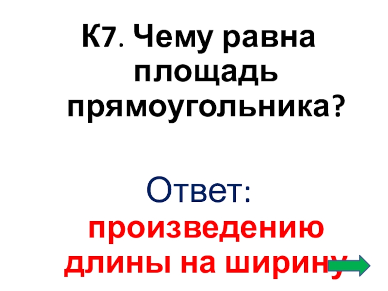 К7. Чему равна площадь прямоугольника? Ответ: произведению длины на ширину