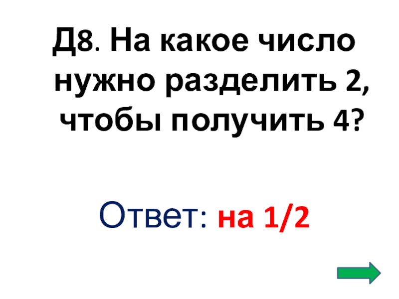 Слайд 28Д8. На какое число нужно разделить 2, чтобы получить 4?