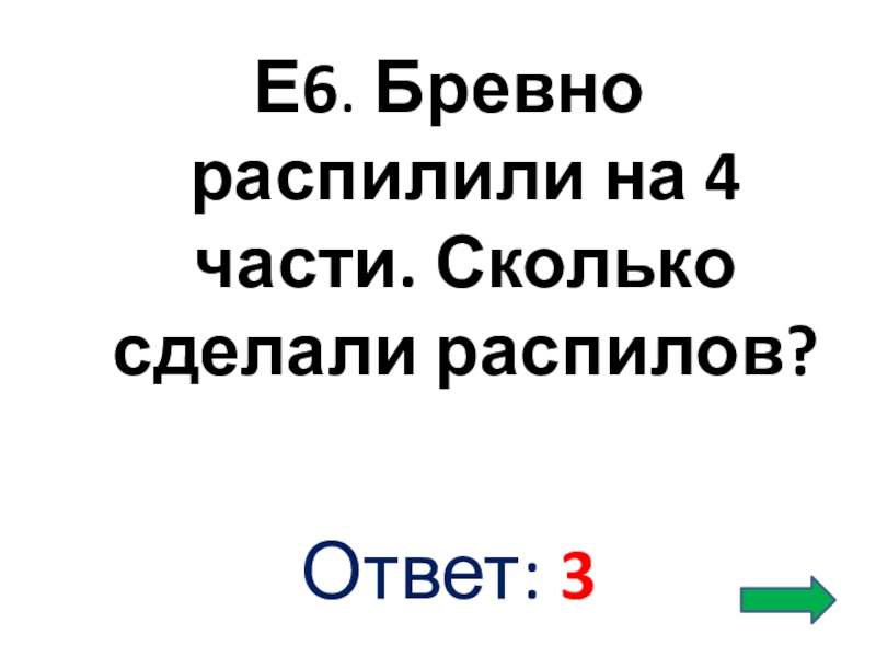 Слайд 33Е6. Бревно распилили на 4 части. Сколько сделали распилов?