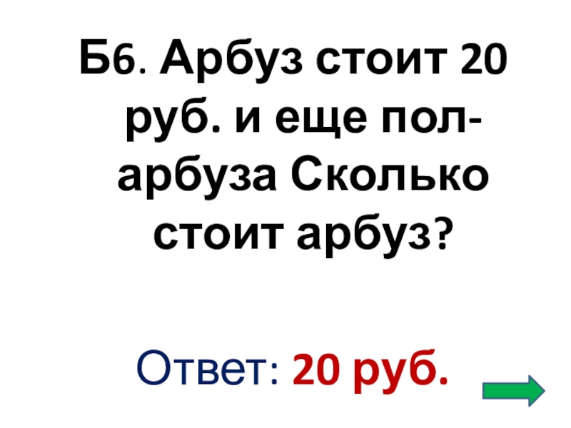 Слайд 11Б6. Арбуз стоит 20 руб. и еще пол-арбуза Сколько стоит арбуз?