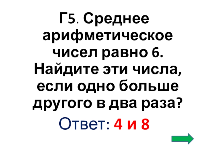 Слайд 20Г5. Среднее арифметическое чисел равно 6. Найдите эти числа, если одно