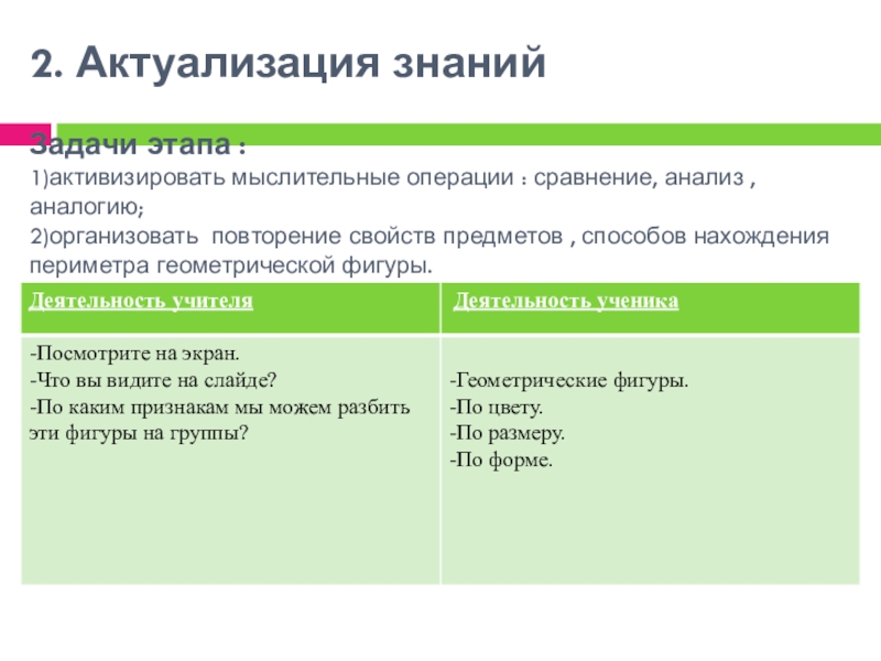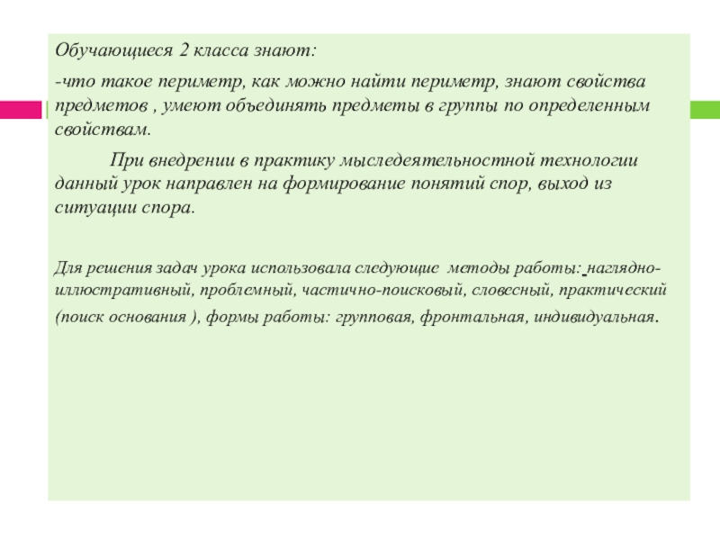 2)организовать повторение свойств предметов , способов нахождения периметра геометрической фигуры.