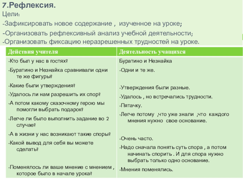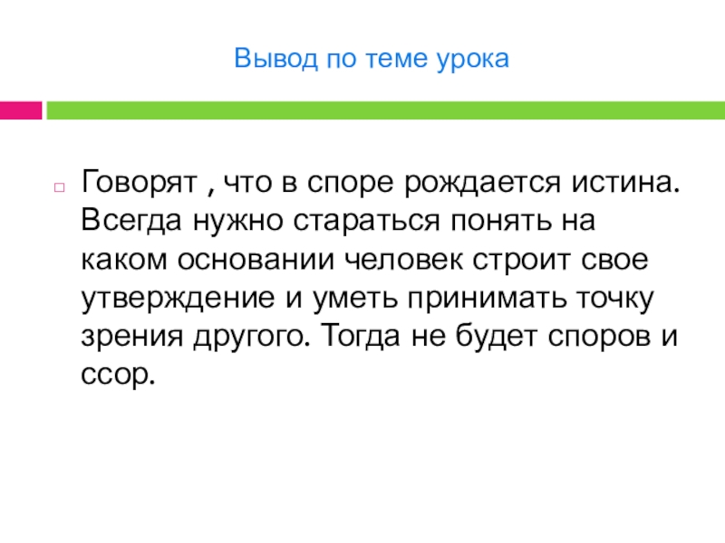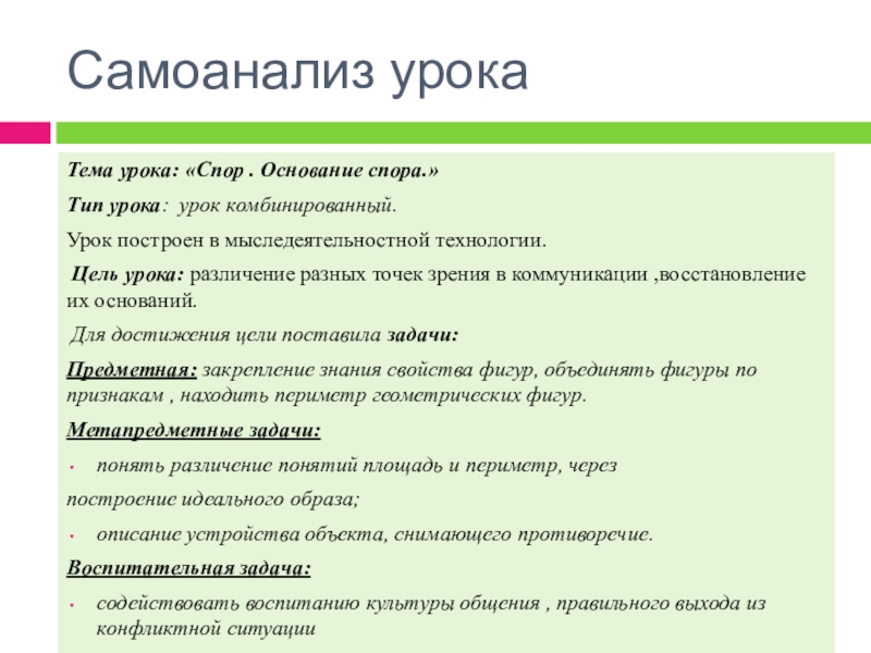 При внедрении в практику мыследеятельностной технологии данный урок направлен на формирование понятий спор, выход из ситуации спора.