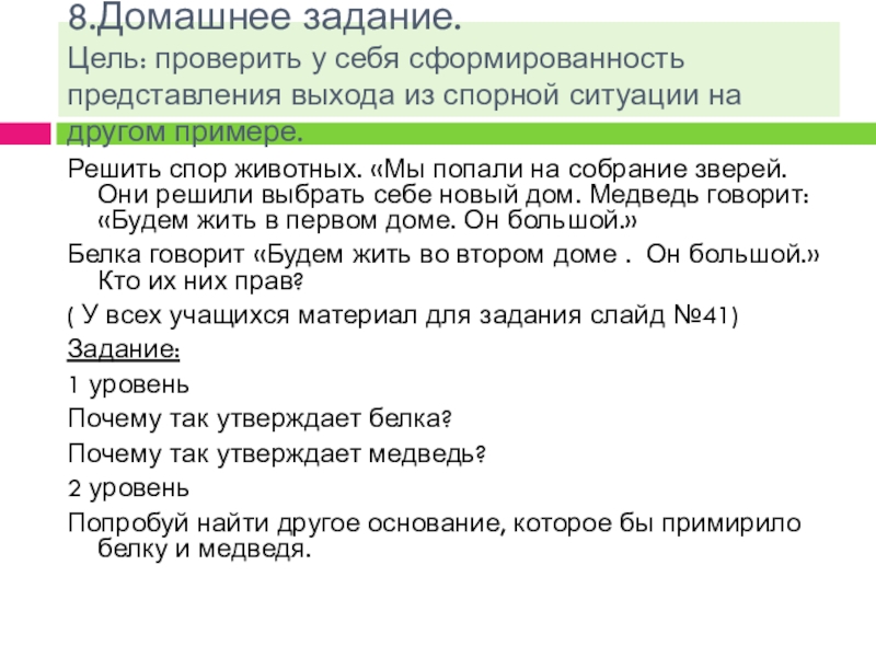 Решить спор животных. «Мы попали на собрание зверей. Они решили выбрать себе новый дом. Медведь говорит: «Будем жить в первом доме. Он большой.»