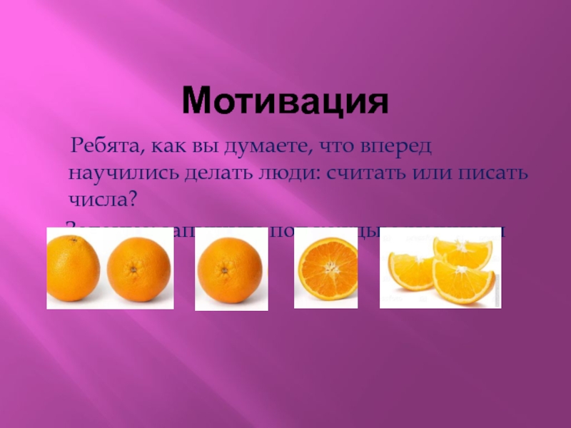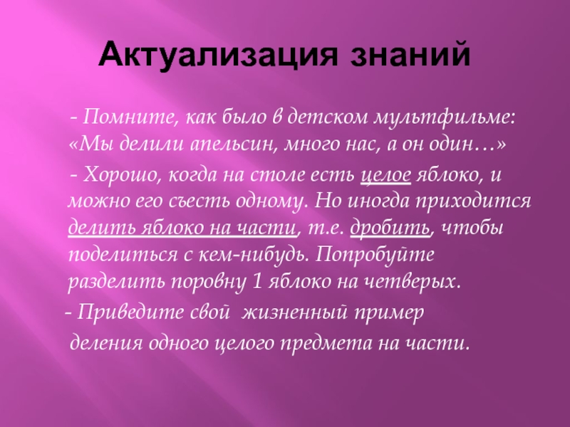 - Хорошо, когда на столе есть целое яблоко, и можно его съесть одному. Но иногда приходится делить яблоко на части, т.е. дробить, чтобы поделиться с кем-нибудь. Попробуйте разделить поровну 1 яблоко на четверых.