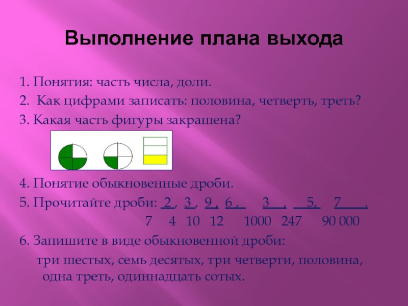 урока: сформировать понятие дроби и подготовить учащихся к изучению сравнения дробей и арифметических действий с ними