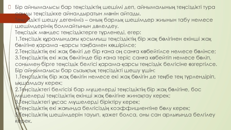 Слайд 4Бір айнымалысы бар теңсіздіктің шешімі деп, айнымалының теңсіздікті тура санды теңсіздікке