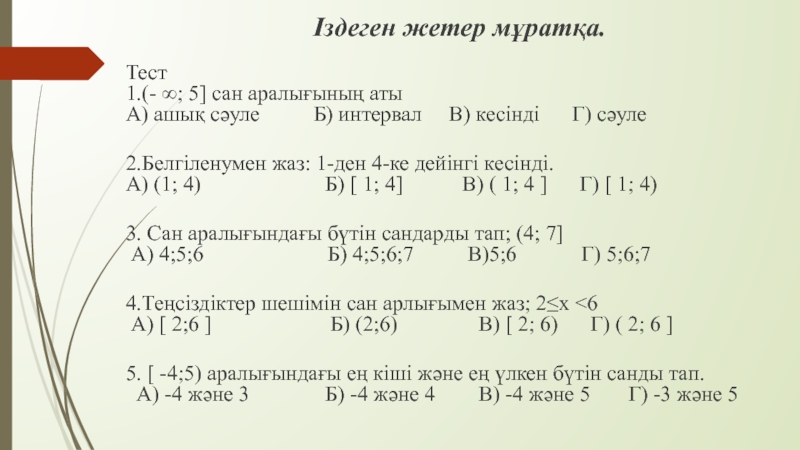 Іздеген жетер мұратқа. Тест 1.(- ∞; 5] сан аралығының аты А) ашық сәуле