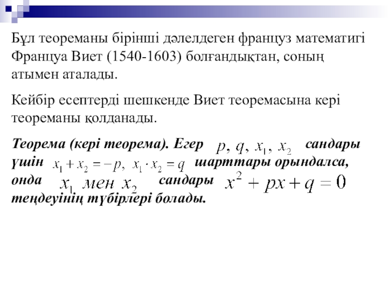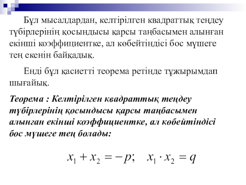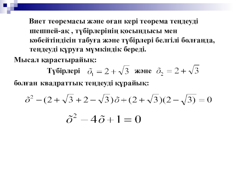 Слайд 8 Виет теоремасы және оған кері теорема теңдеуді шешпей-ақ