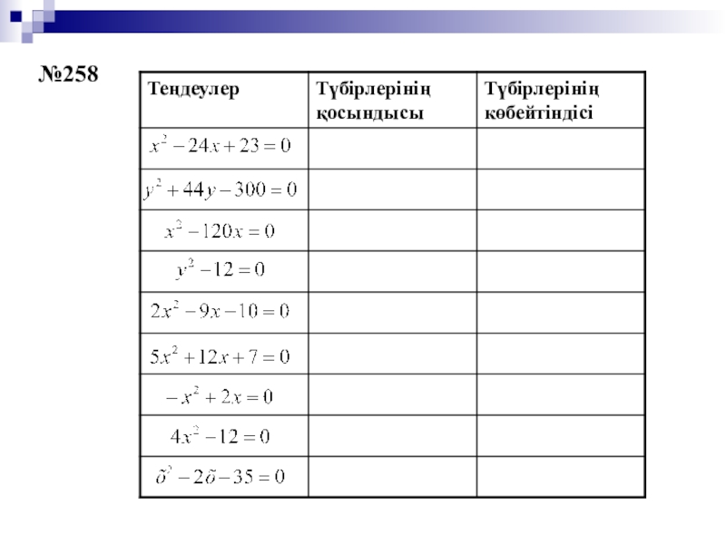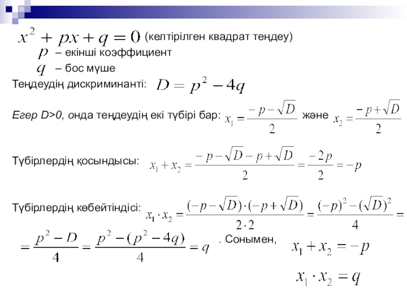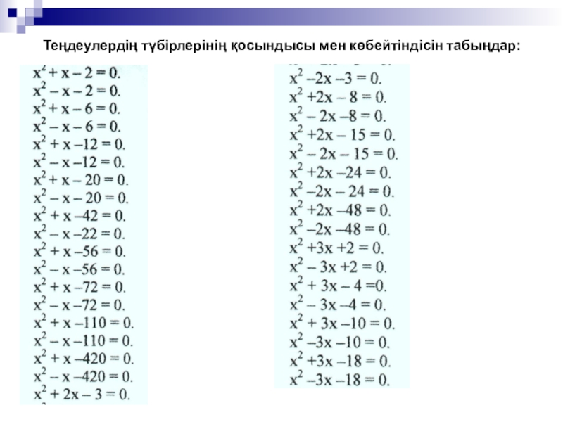 Слайд 4Түбірлері бар бірнеше келтірілген квадраттық теңдеудің түбірлерін, түбірлерінің қосындысы мен көбейтіндісінің