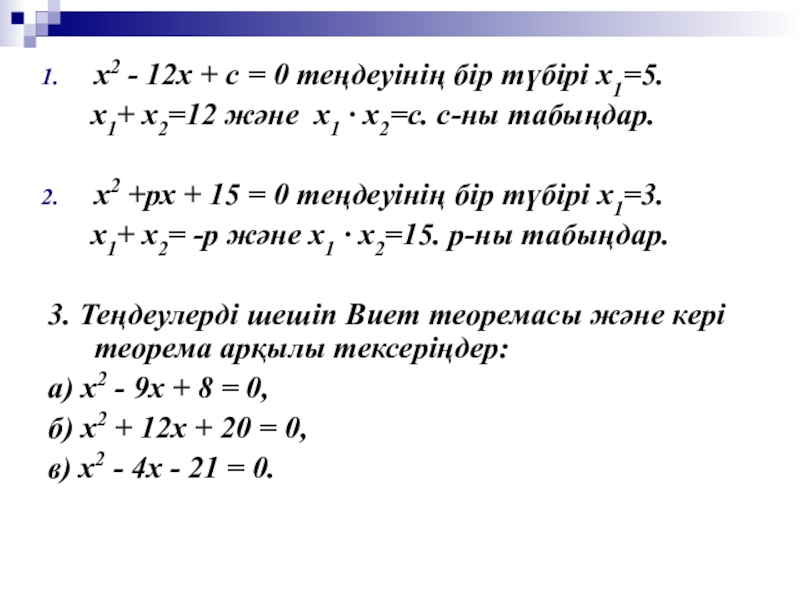 3. Теңдеулерді шешіп Виет теоремасы және кері теорема арқылы тексеріңдер: