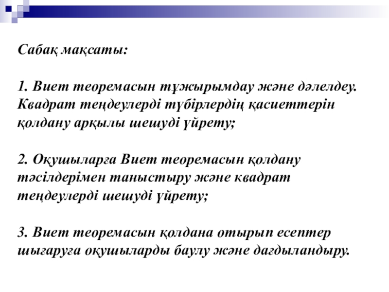 қасиеттерін қолдану арқылы шешуді үйрету; 2. Оқушыларға Виет теоремасын қолдану тәсілдерімен таныстыру және квадрат теңдеулерді шешуді үйрету; 3. Виет теоремасын қолдана отырып есептер шығаруға оқушыларды баулу және дағдыландыру.
