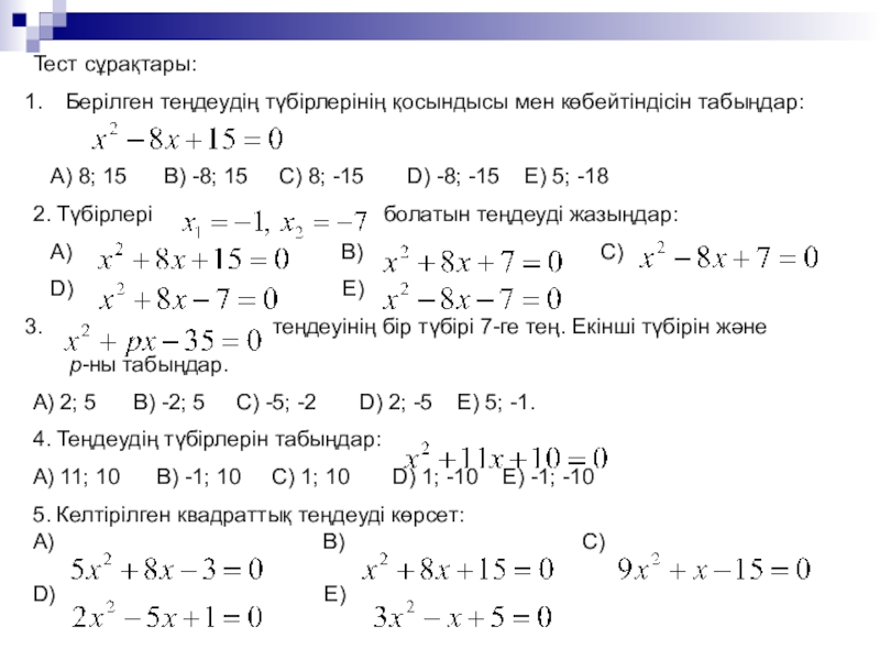 Тест сұрақтары:Берілген теңдеудің түбірлерінің қосындысы мен көбейтіндісін табыңдар: