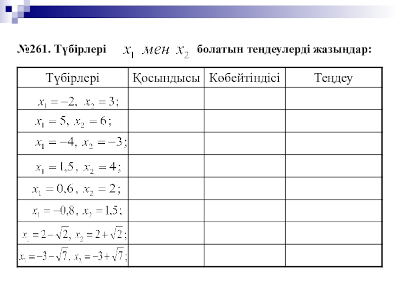 Түбірлері бар бірнеше келтірілген квадраттық теңдеудің түбірлерін, түбірлерінің қосындысы мен көбейтіндісінің мәндерін табыңдар және жауаптарын кестеге толтырыңдар.