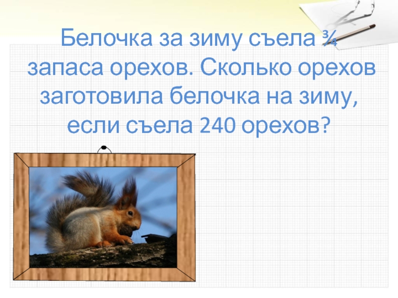 Слайд 7Белочка за зиму съела ¾ запаса орехов. Сколько орехов заготовила белочка