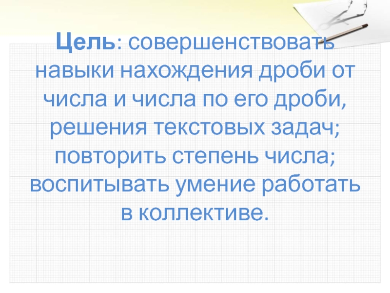 Слайд 2Цель: совершенствовать навыки нахождения дроби от числа и числа по его