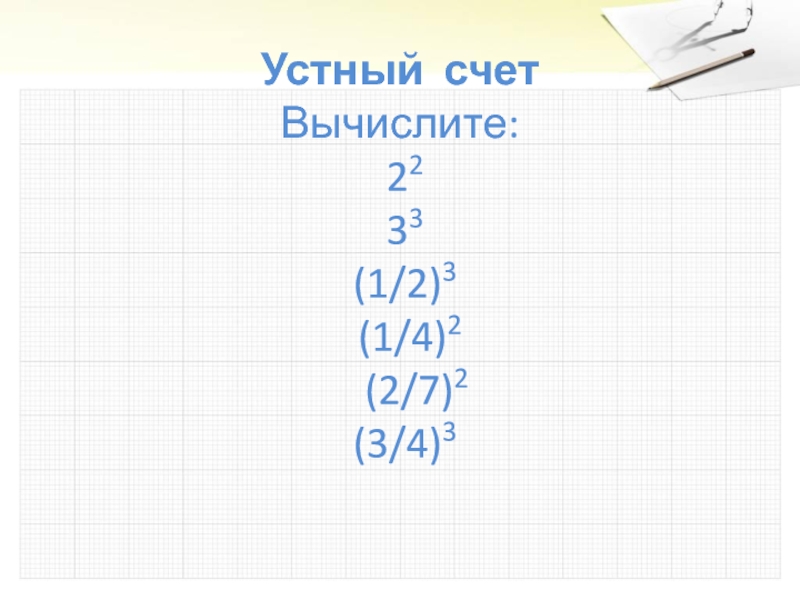 Слайд 4Устный счет Вычислите: 22 33 (1/2)3 (1/4)2 (2/7)2