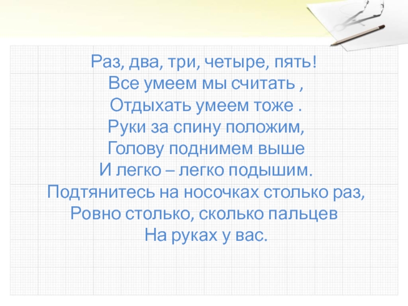Раз, два, три, четыре, пять!  Все умеем мы считать ,  Отдыхать умеем тоже .