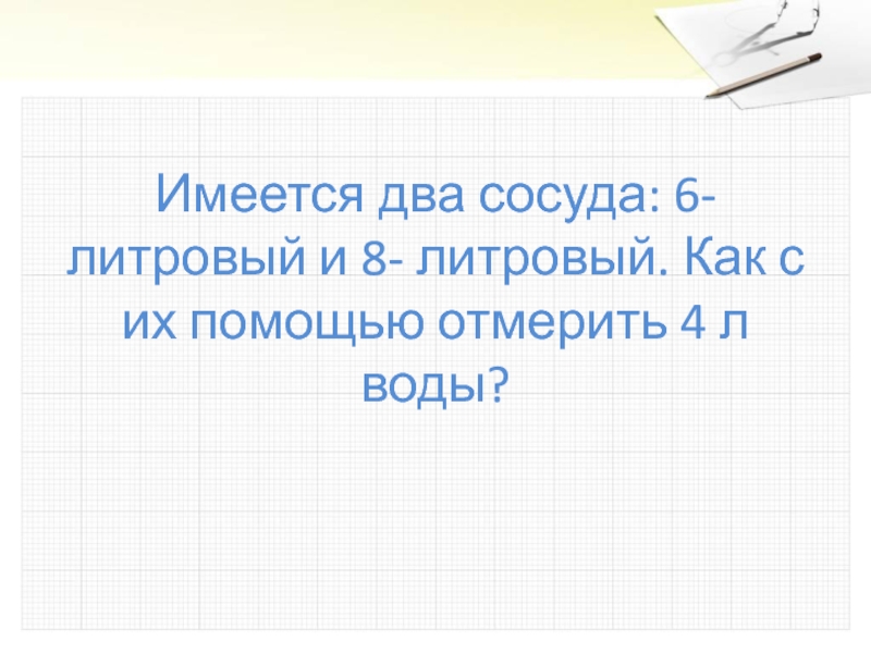 Слайд 6Имеется два сосуда: 6- литровый и 8- литровый. Как с их