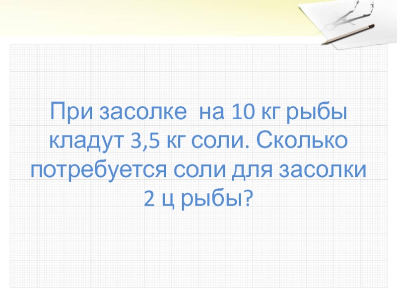 Слайд 5 При засолке на 10 кг рыбы кладут 3,5 кг соли. Сколько