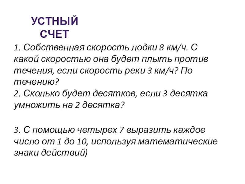 1. Собственная скорость лодки 8 км/ч. С какой скоростью она будет плыть против течения, если скорость реки 3 км/ч? По течению?