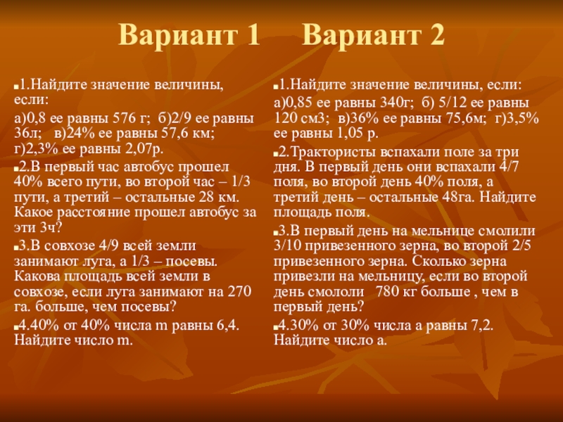 а)0,85 ее равны 340г; б) 5/12 ее равны 120 см3; в)36% ее равны 75,6м; г)3,5% ее равны 1,05 р.