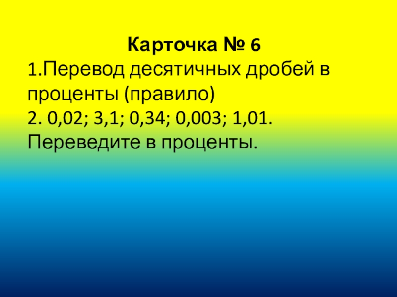 Карточка № 61.Перевод десятичных дробей в проценты (правило)2. 0,02; 3,1; 0,34; 0,003; 1,01.Переведите в проценты.