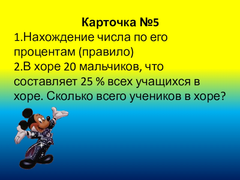 Карточка №51.Нахождение числа по его процентам (правило)2.В хоре 20 мальчиков, что составляет 25 % всех учащихся в