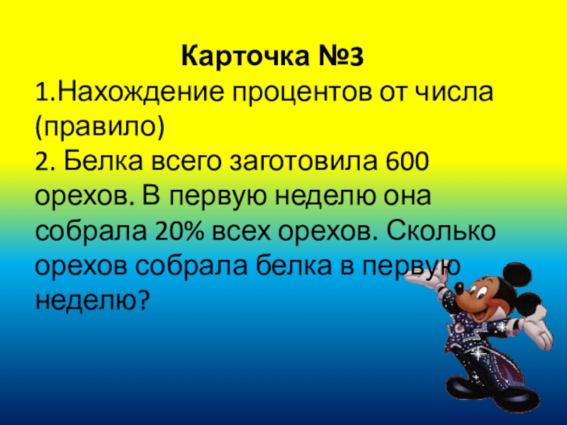 Карточка №31.Нахождение процентов от числа (правило)2. Белка всего заготовила 600 орехов. В первую неделю она собрала 20%