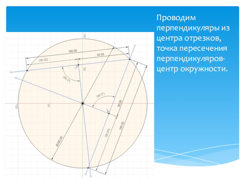 Слайд 6Проводим перпендикуляры из центра отрезков, точка пересечения перпендикуляров-центр окружности.