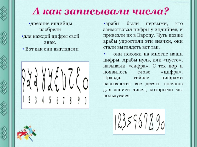 они похожи на многие наши цифры. Арабы нуль, или «пусто», называли «сифра». С тех пор и появилось слово «цифра». Правда, сейчас цифрами называются все десять значков для записи чисел, которыми мы пользуемся
