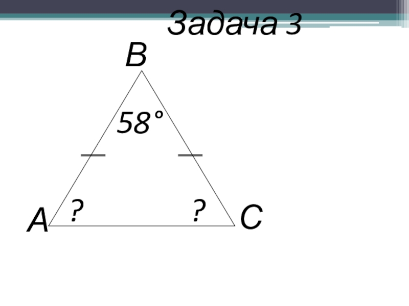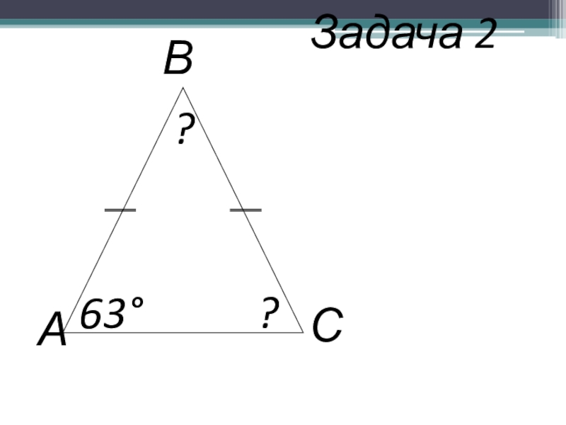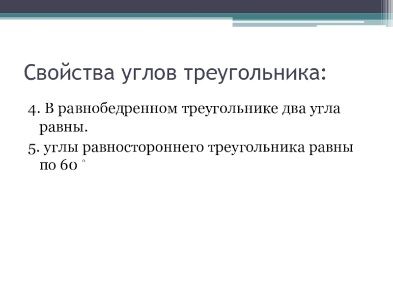 Свойства углов треугольника:4. В равнобедренном треугольнике два угла равны.5. углы равностороннего треугольника равны по 60 ◦