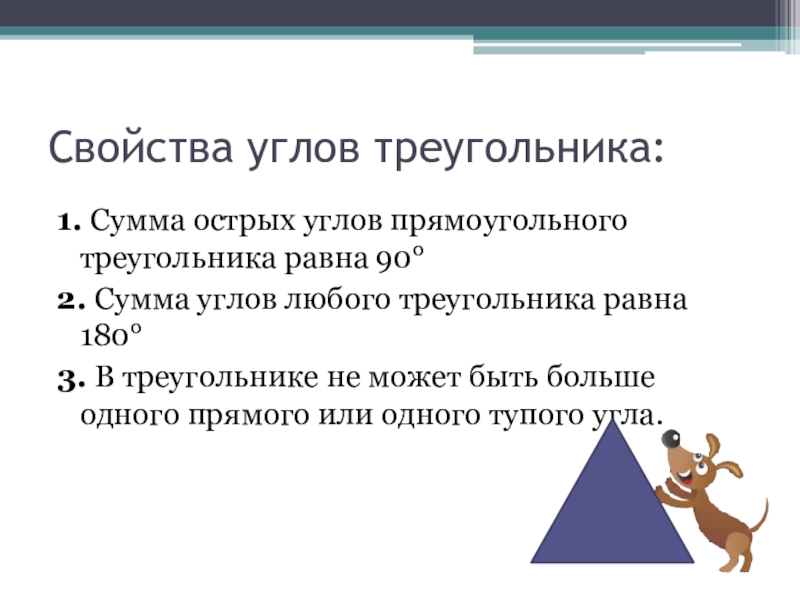 Свойства углов треугольника:1. Сумма острых углов прямоугольного треугольника равна 90° 2. Сумма углов любого треугольника равна 180° 3. В треугольнике