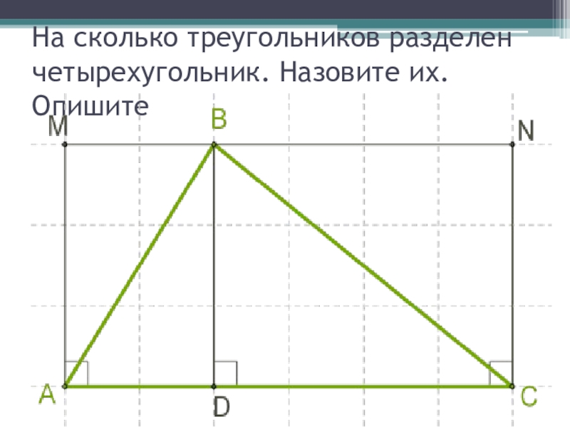 Слайд 3На сколько треугольников разделен четырехугольник. Назовите их. Опишите