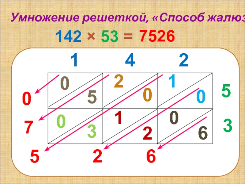 Умножение решеткой, «Способ жалюзи»   142 × 53 =12453502010031260625707526