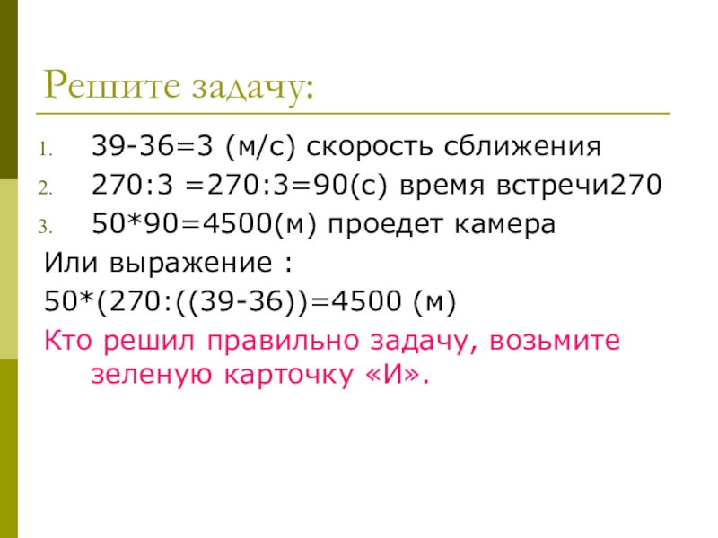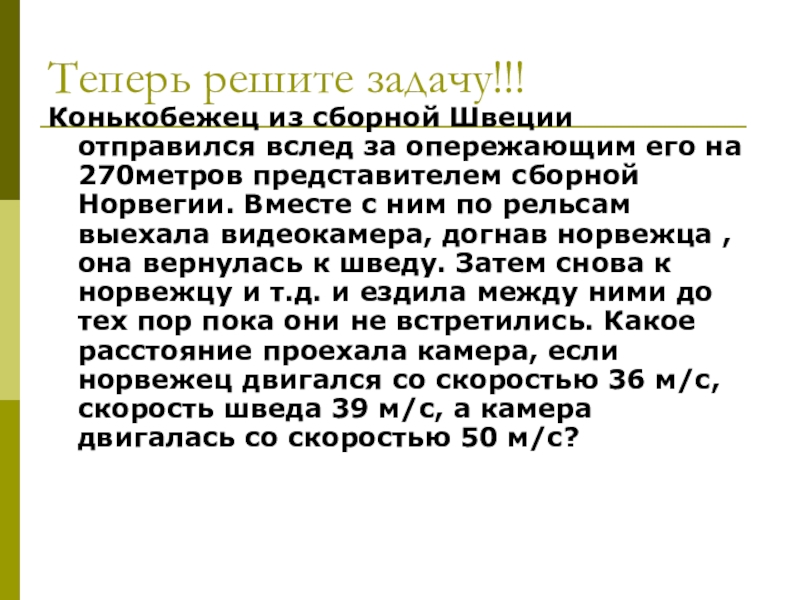 на 270метров представителем сборной Норвегии. Вместе с ним по рельсам выехала видеокамера, догнав норвежца , она вернулась к шведу. Затем снова к норвежцу и т.д. и ездила между ними до тех пор пока они не встретились. Какое расстояние проехала камера, если норвежец двигался со скоростью 36 м/с, скорость шведа 39 м/с, а камера двигалась со скоростью 50 м/с?