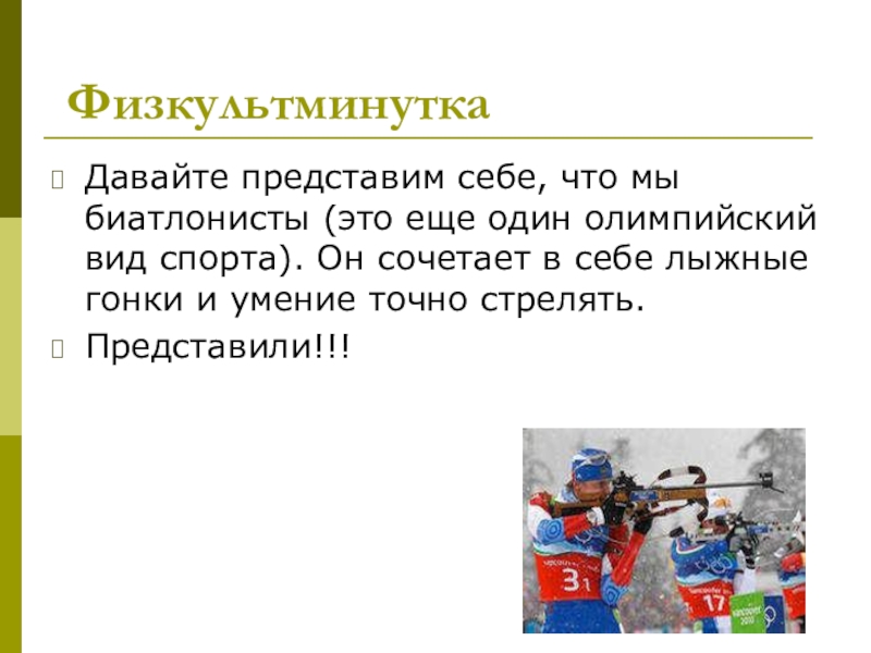 Слайд 19Представим себе, что мы биатлонисты. Для этого сначала подвигаем рукам, так