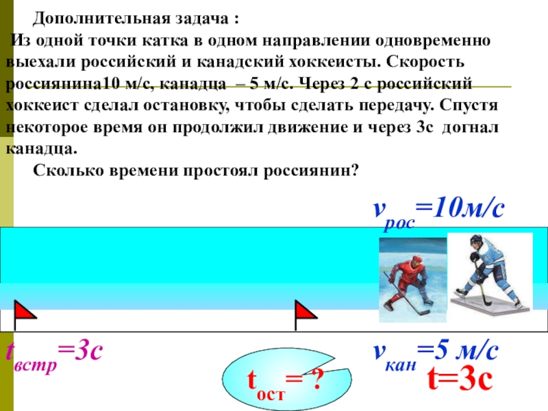 в одном направлении одновременно выехали российский и канадский хоккеисты. Скорость россиянина10 м/с, канадца – 5 м/с. Через 2 с российский хоккеист сделал остановку, чтобы сделать передачу. Спустя некоторое время он продолжил движение и через 3с догнал канадца.