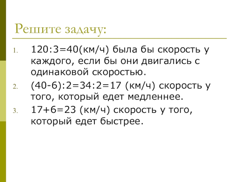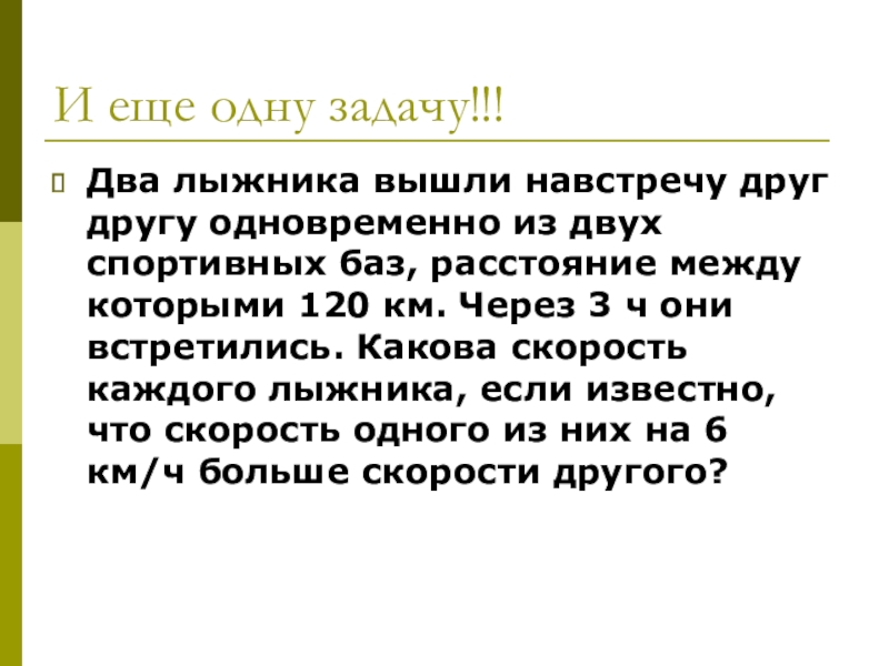 (120:3-6):2=17 (км/ч) скорость того лыжника, который идет