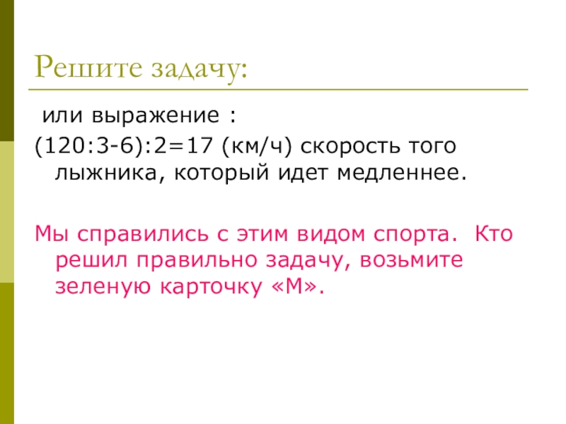 Мы справились с этим видом спорта. Кто решил правильно задачу, возьмите зеленую карточку «М».