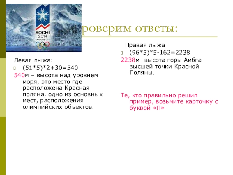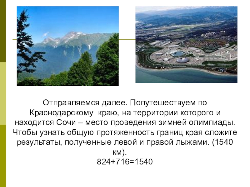 Сочи – место проведения зимней олимпиады. Чтобы узнать общую протяженность границ края сложите результаты, полученные левой и правой лыжами. (1540 км).