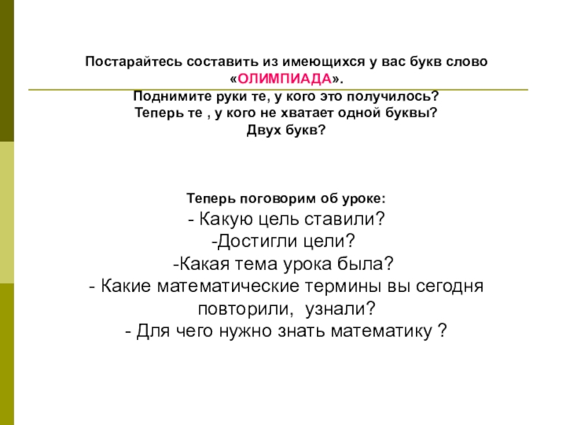 Слайд 34Постарайтесь составить из имеющихся у вас букв слово «ОЛИМПИАДА».
