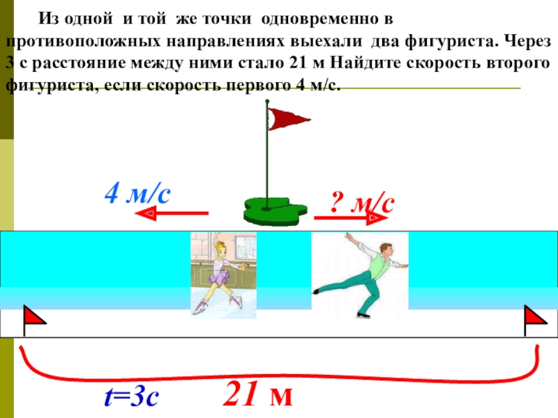 точки одновременно в противоположных направлениях выехали два фигуриста. Через 3 с расстояние между ними стало 21 м Найдите скорость второго фигуриста, если скорость первого 4 м/с.