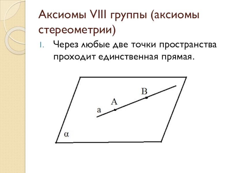 Слайд 34Аксиомы VIII группы (аксиомы стереометрии):